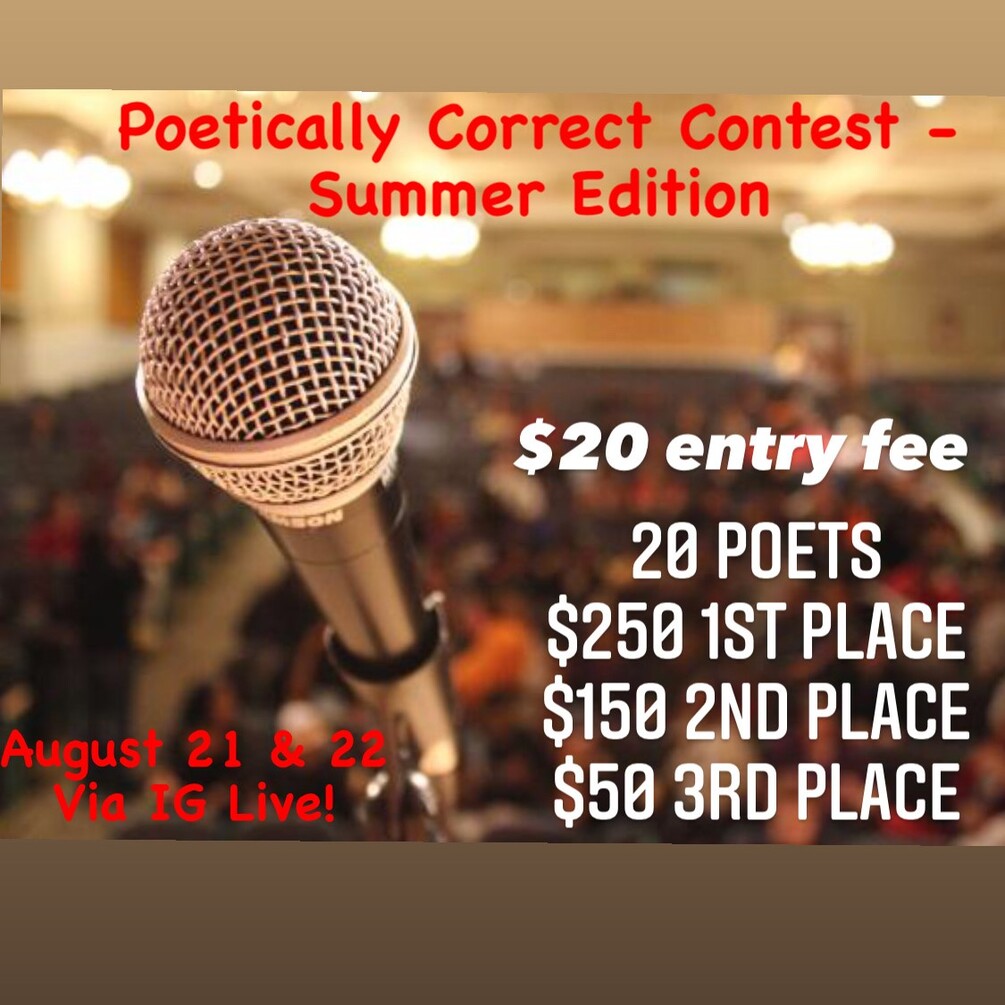 Poetically Correct Contest is back for the summer edition ! All performances are less than 5 minutes long and will be judged officially. Past contests are available on youtube.com/aaronRthepoet. Register/sign up to lock in your spot !! First 20 contestants to pay will be selected! May pay by pay pal, cash app ( $arozay4)